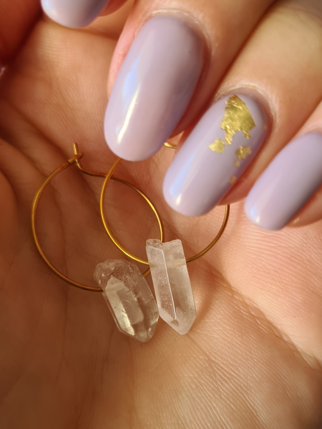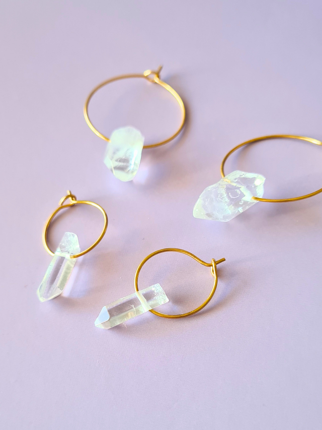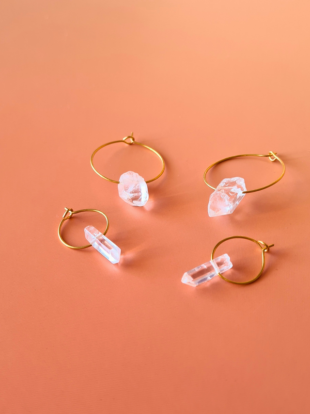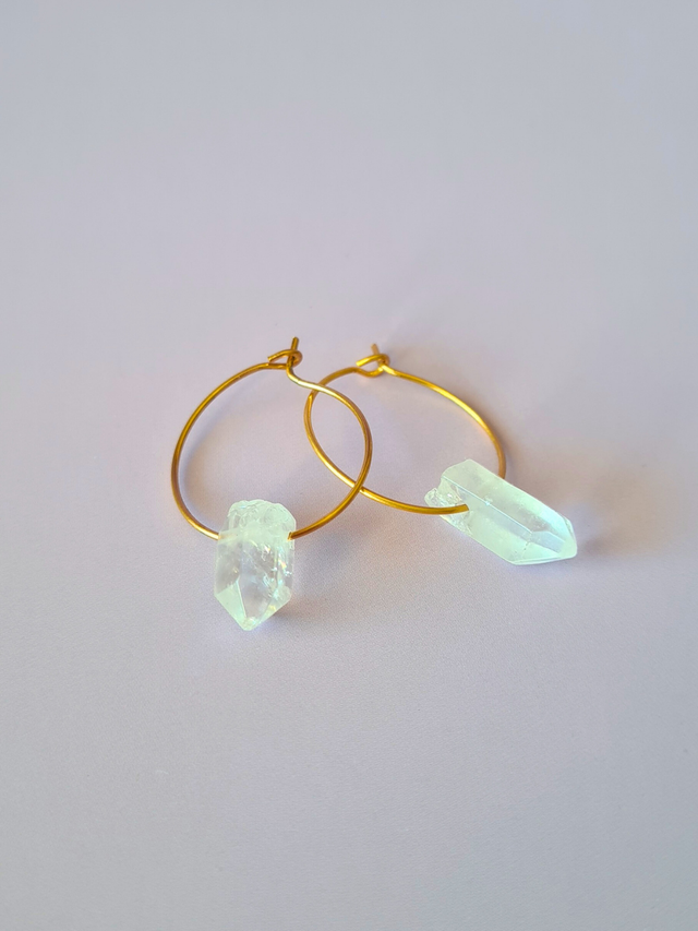 Le cristal de roche, conservé dans sa forme brute et pointue, agit comme une lame de lumière : il tranche le flou, dissipe les brumes intérieures et laisse circuler l’essentiel. Portée près du visage, cette pierre claire devient un talisman d’alignement, une présence silencieuse qui rappelle de porter un regard clair autour de toi et en toi.